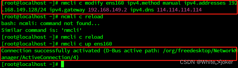 - [root@localhost ~]# nmcli c modify ens160 ipv4.method manual ipv4.addresses 192.168.149.128/24 ipv4.gateway 192.168.149.2 ipv4.dns 192.168.149.128