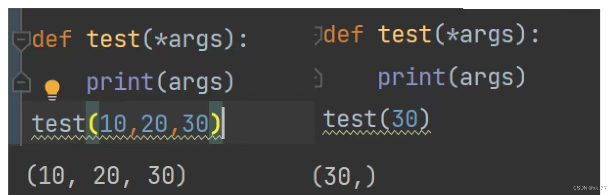 可变参数:*args,用来传递任意个参数,以元组的形式传递;