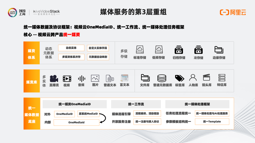 最底层是统一媒资的数据底座,1)对直播、点播等不同服务的媒体信息构建OneMediaID,2)通过媒体流程引擎和开放服务注册构建统一工作流,3)通过统一任务处理流程、管道定义、参数模板构建统一媒体处理协议框架。