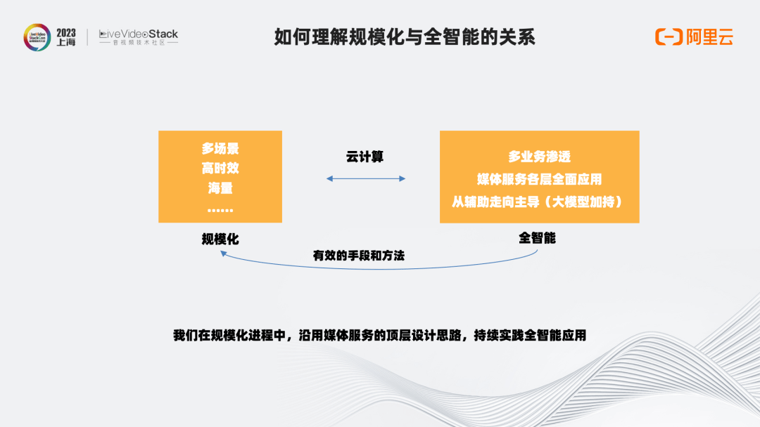“规模化”和“全智能”看似无关,实际在云计算场景下它们关联密切,规模化全场景意味着AI对多业务的渗透,而AI的加入对媒体业务的时效性有较大提升,AI+云计算则令海量的视频智能处理成为可能。总体来看,全智能是实现规模化有效的手段和方法,并且随着大模型技术的发展,以前AI最被诟病的效果问题也有了相当的改善,媒体处理与生产的质量得到显著提升。我们在规模化进程中也会沿用媒体服务的顶层设计思路,持续实践全智能应用。
