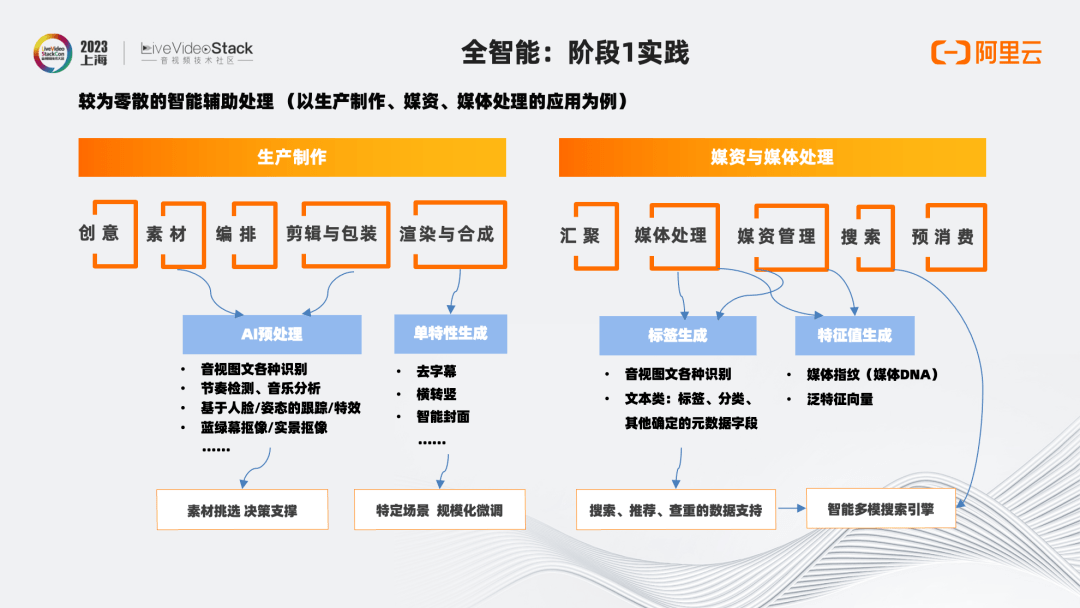 在媒资与媒体处理的环节中,AI主要针对视频进行单一维度的内容理解,生成一些标签和特征值作为下一步骤的数据支持,人的参与至关重要,也难以进行全流程的规模化。