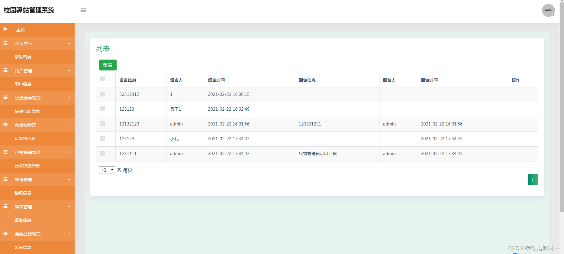 校园驿站管理系统在Eclipse环境中,使用Java语言进行编码,使用Mysql创建数据表保存本系统产生的数据。系统可以提供信息显示和相应服务,其管理员管理快递仓库信息,管理待发货信息,管理已收快递,管理物流以及留言信息,管理员工和用户资料。员工更改物流信息,管理快递仓库信息,管理待发货信息,管理已收快递,发布留言信息。用户签收快递,查看系统公告,发布留言,查看已收快递信息,查看快递物流信息。