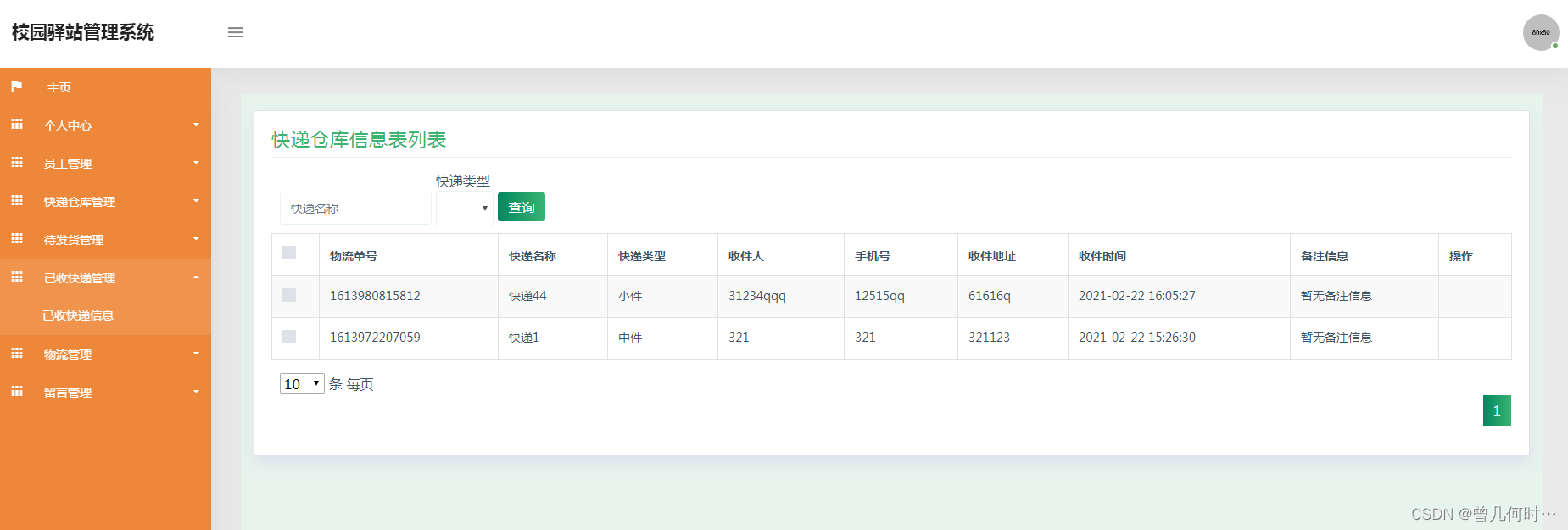 管理员进入指定功能操作区之后可以管理已收快递信息。其页面见下图。管理员在页面内查询已收快递,修改,删除已收快递信息。