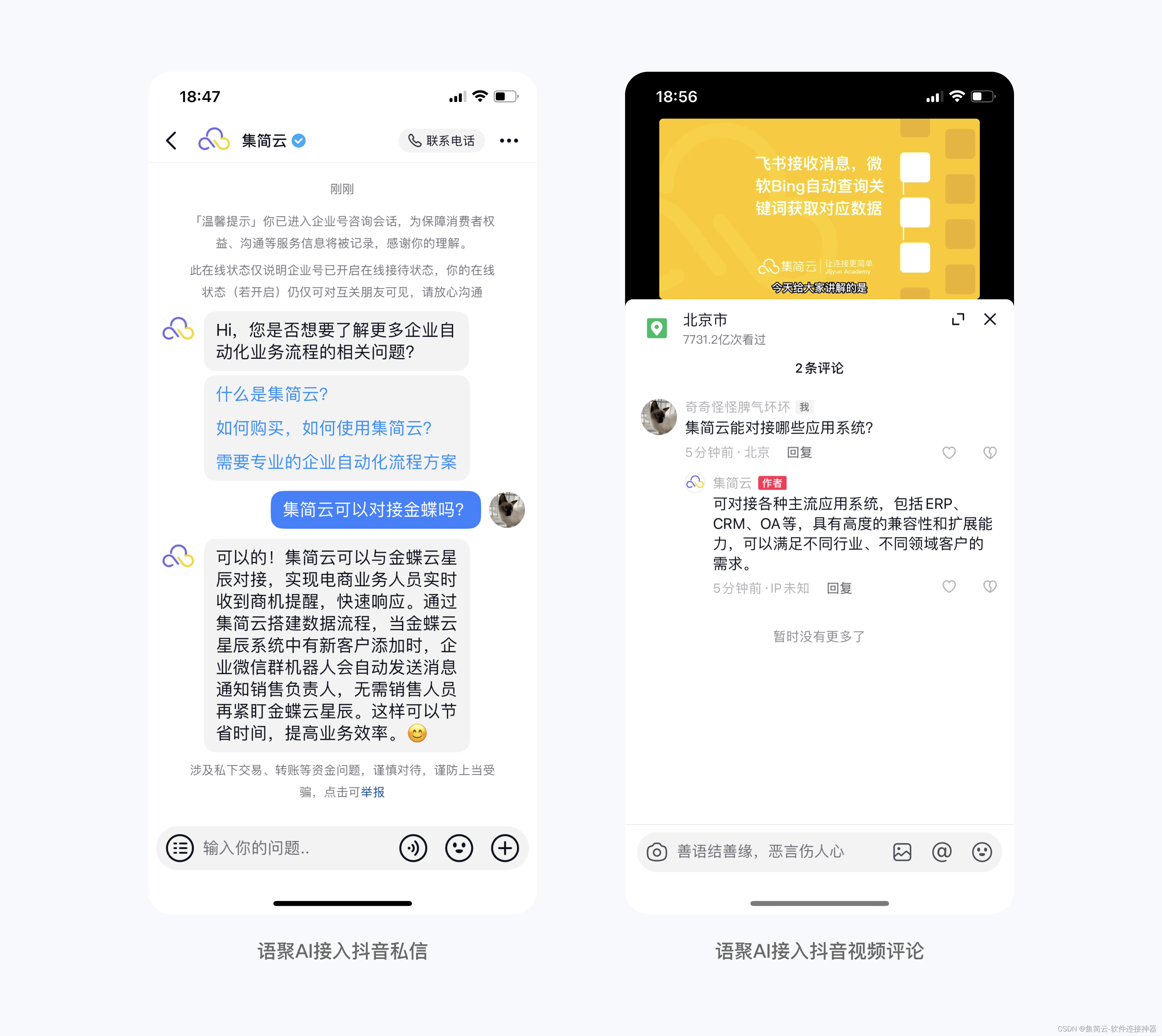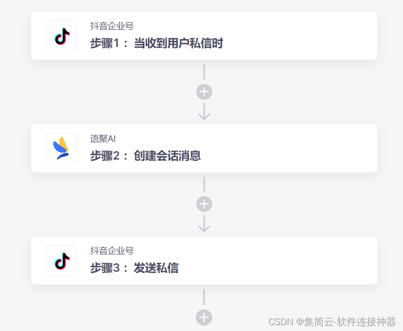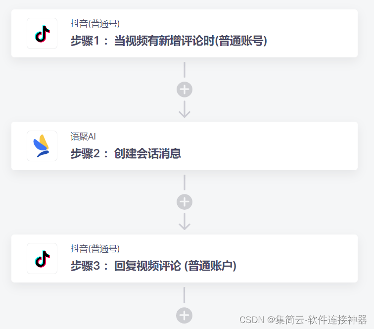您可以通过集简云数据流程,将语聚AI助手集成到抖音视频评论、抖音私信,实现自动回复用户视频评论、私信问答,大大提升账号互动与运营效率。