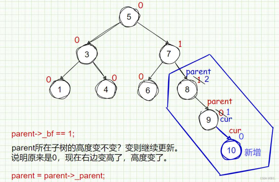 我们以上图为例,8结点作为父亲结点,平衡因子发生了变化,这就有可能继续导致8结点的父亲结点的平衡因子发生变化。