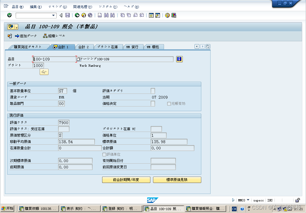 MM03 品目照会 品目 100-100 是标准原价,价格是 135.98 EUR