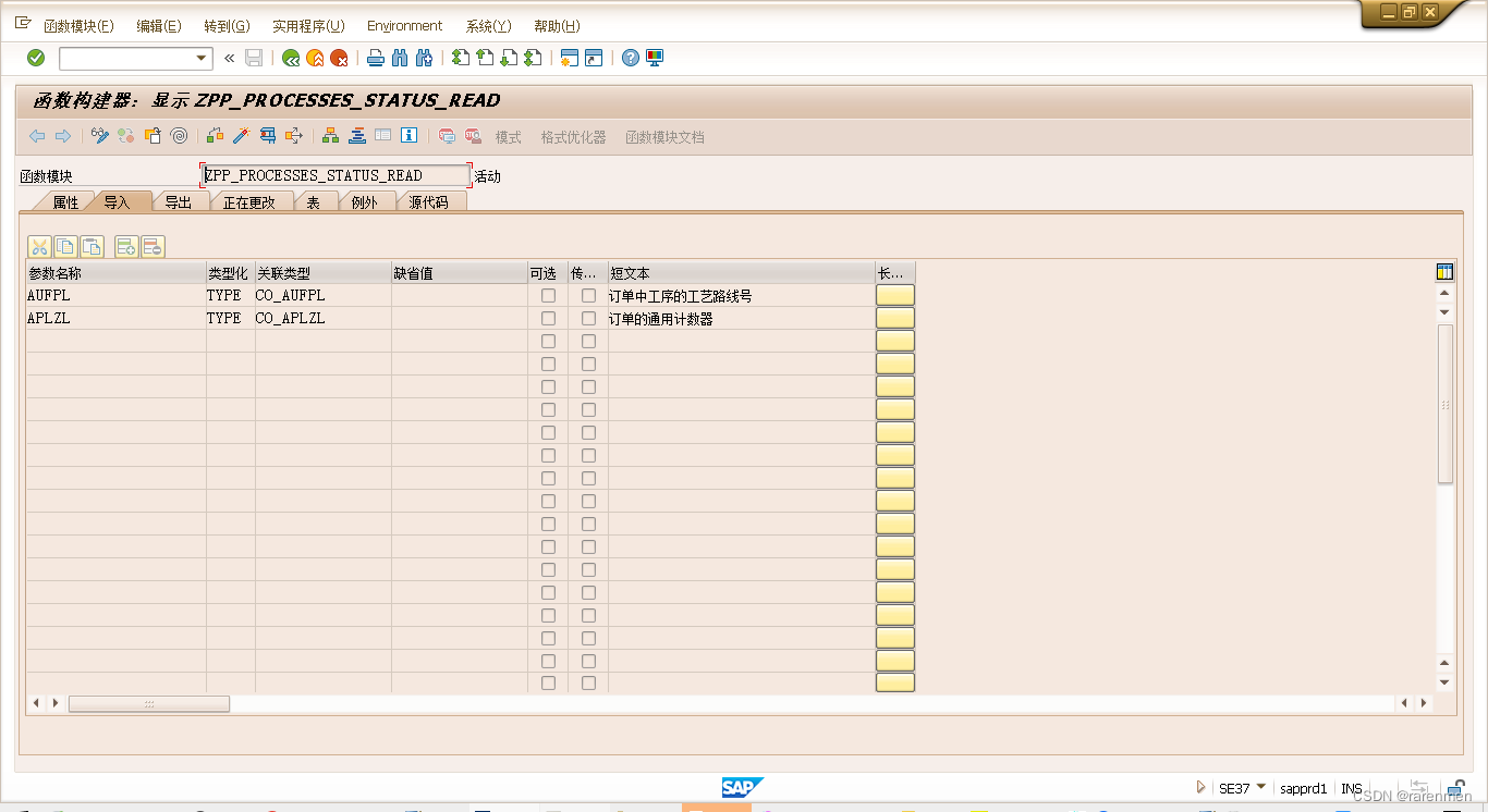 在开发一个涉及工序的Report的过程中发现,SAP仅提供了Function去获取订单的状态,没有提供获取订单工序状态的Function。考虑到后续开发的过程中,还需要复用到这个功能,于是打算按这个需求去开发一个Function,传入AFVC表的主键,返回的是把该工序的全部已激活的状态,串成一个以空格分隔的字符串返回。