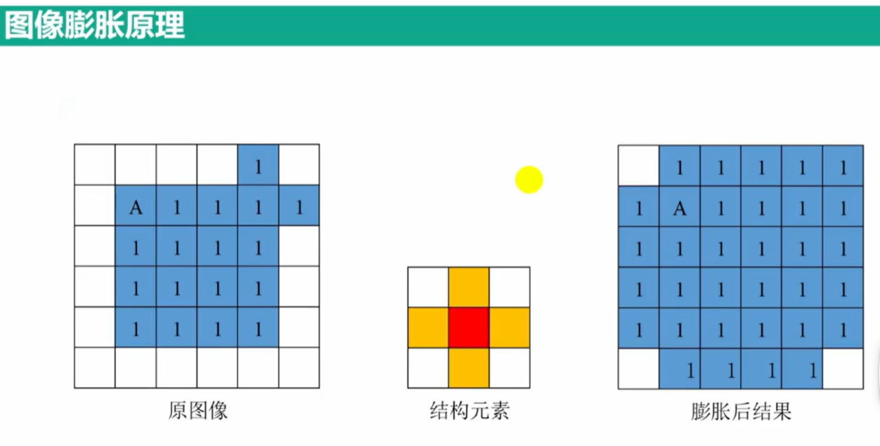 图像膨胀的原理是将一个结构元素(也称为核或模板)在图像上滑动,并将其与图像中对应位置的像素进行比较。如果结构元素的所有像素与图像中对应位置的像素都匹配,那么该位置的像素值保持不变。如果结构元素的任何一个像素与图像中对应位置的像素不匹配,那么 图像中对应位置的像素被置为1,从而改变了图像的形状和结构。