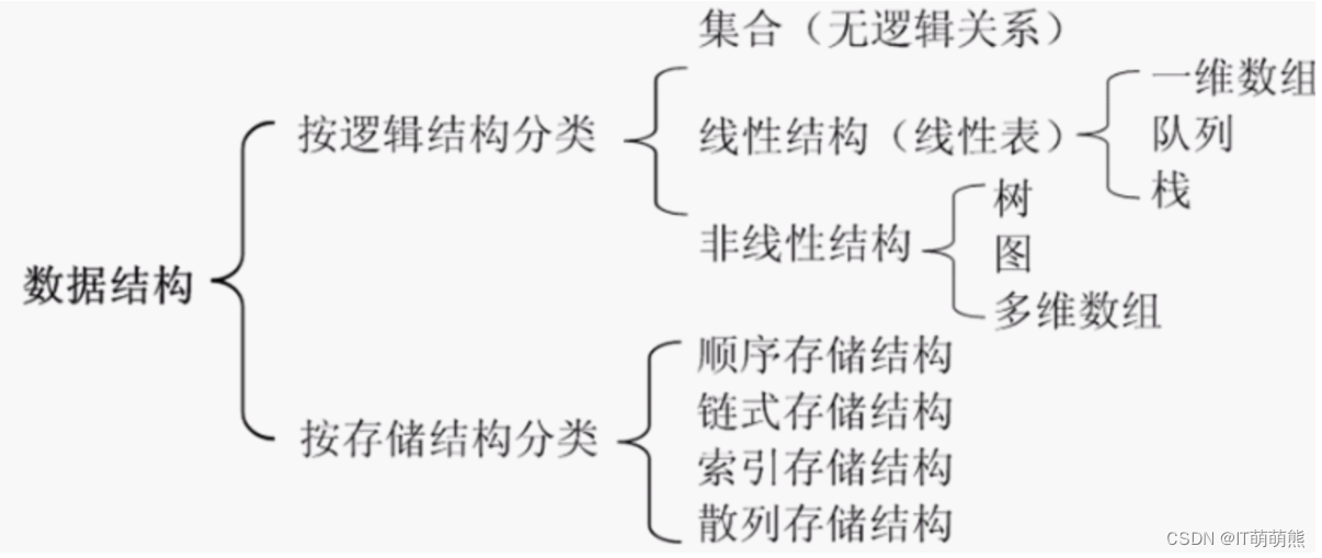 (1)集合:结构中的数据元素之间除了“同属一个集合”的关系之外,别无其他关系;