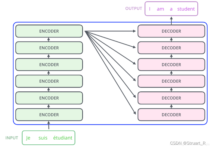 注意:在Transformer结构中左右两侧的N×就是Encoder和Decoder的个数,另外最后一个Encoder将输出两个值(输出序列和注意力机制的权重)到每一个Decoder模块结合,后面会说这个过程。