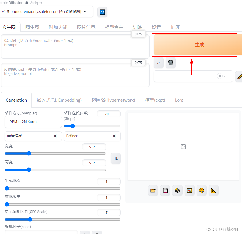 Batch count、 Batch size: 都是生成几张图,前者计算时间长,后者需要显存大