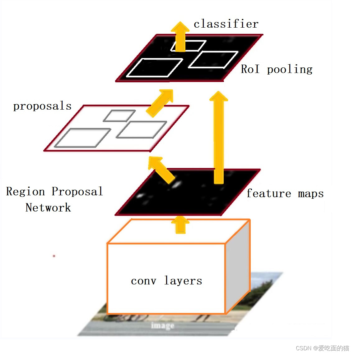 输入图片------对图片进行深度特征的提取(主干神经网络)------RPN网络完成滑动窗口所完成的任务,也就是产生候选区域,完成候选区域分类(背景和目标)对目标的位置进行初步定位-------为了不重复的计算CNN特征,通过roi_pooling完成抠图操作-----fc全连接层对候选区域进行表示----分类和回归对候选目标的类别判定和位置精修(得到物体的真实类别)