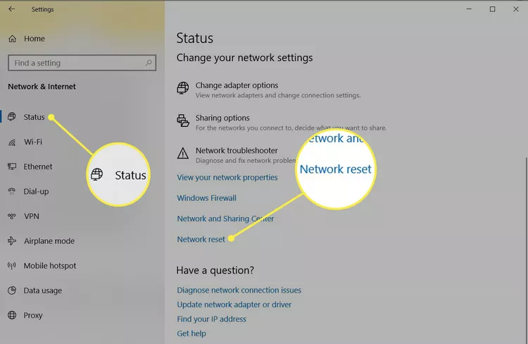 二、在左侧导航窗格中,选择“状态”以确保你正在查看网络状态窗口。然后向下滚动,直到你看到“网络重置”链接。