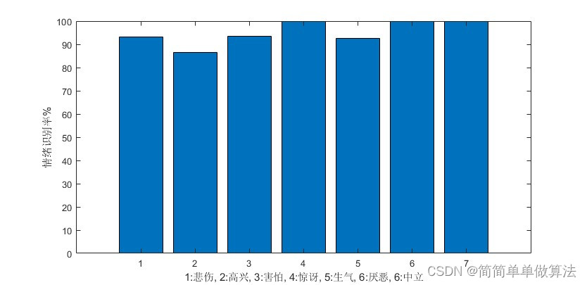 - xlabel('1:悲伤, 2:高兴, 3:害怕, 4:惊讶, 5:生气, 6:厌恶, 6:中立');