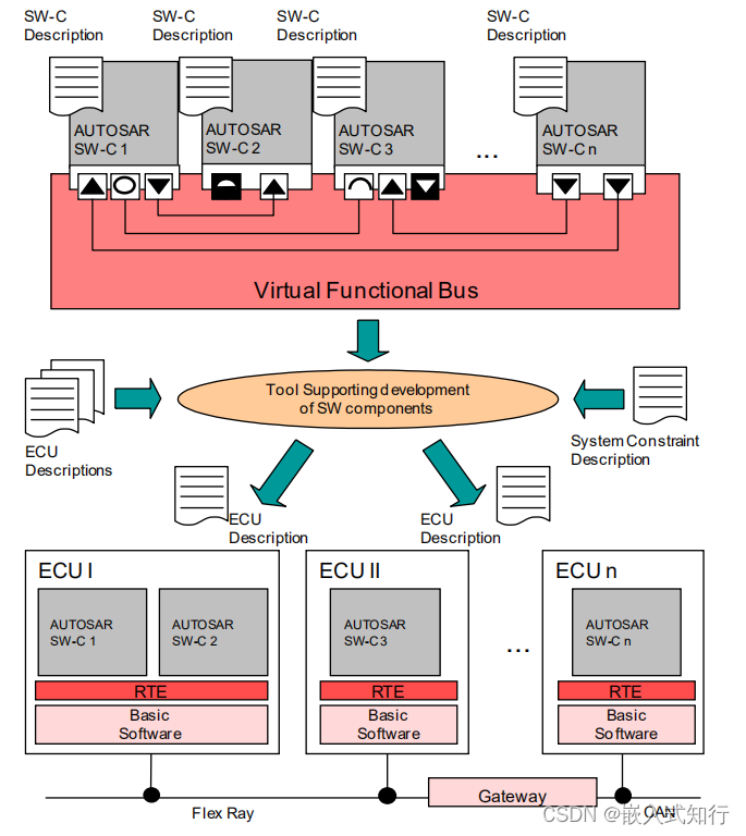 - 开发流程:系统架构设计、软件组件设计、软件组件映射到具体ECU、ECU级开发(RTE\BSW\MCAL)