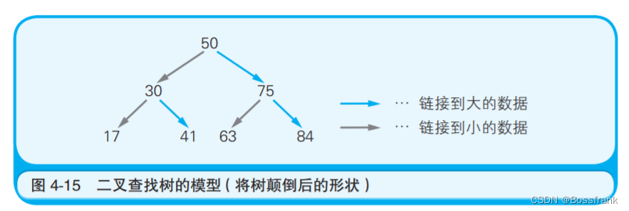 二叉查找树:指在链表的基础上往数组中追加元素时,考虑到数据的大小关系,将其分成左右两个方向的表现形式。