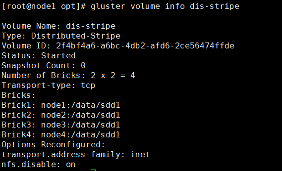 gluster volume create dis-stripe stripe 2 transport tcp server1:/dir1 server2:/dir2 server3:/dir3 server4:/dir4