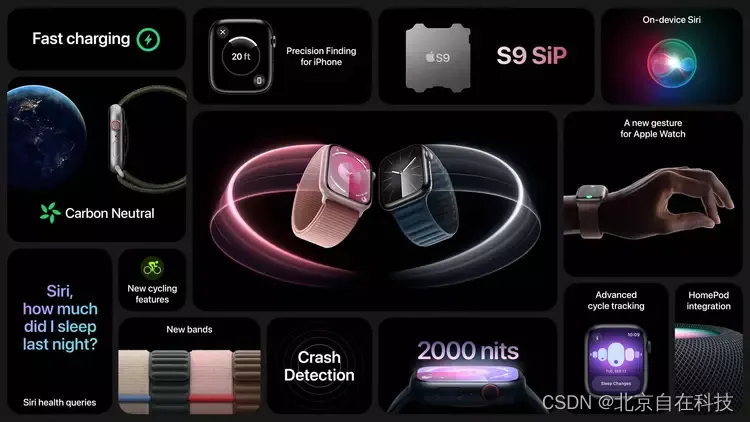 除了iPhone 15系列外,苹果公司还发布了Apple Watch Series 9,搭载全新的S9芯片,晶体管数量达到了56亿个,比上一代产品S8增加了60%,运行速度提高了30%。而在交互体验上,Apple Watch Series 9带来了全新的双指互点手势操作。这一功能将在10月正式上线,届时用户可以通过简单的双指互点操作进行接听电话、关闭闹钟、暂停音乐等操作,使得双手不便时也能轻松操作。