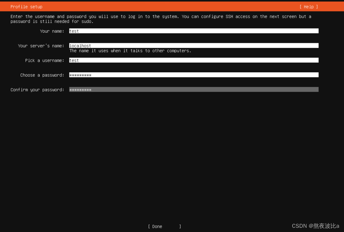 your name 使用者名字 your server’s name 服务器名 pick a username 登录用户名 choose a passwork 设置登陆密码 confirm your password 确认登陆密码