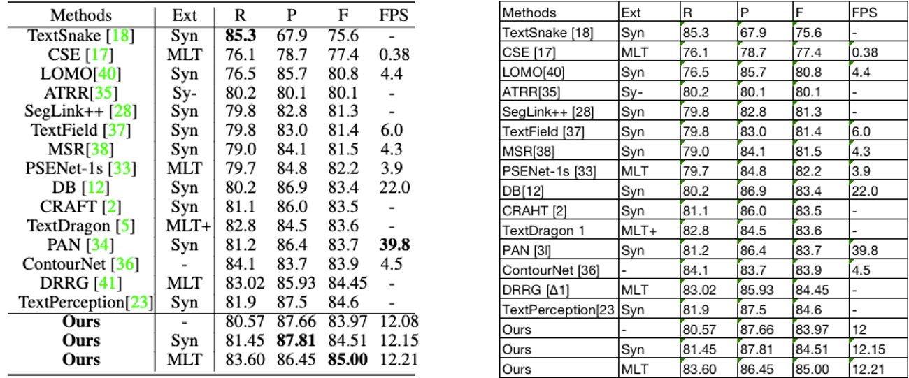 基于回归的算法借鉴通用物体检测算法,通过设定anchor回归检测框,或者直接做像素回归,这类方法对规则形状文本检测效果较好,但是对不规则形状的文本检测效果会相对差一些,比如CTPN[3]对水平文本的检测效果较好,但对倾斜、弯曲文本的检测效果较差,SegLink[8]对长文本比较好,但对分布稀疏的文本效果较差;