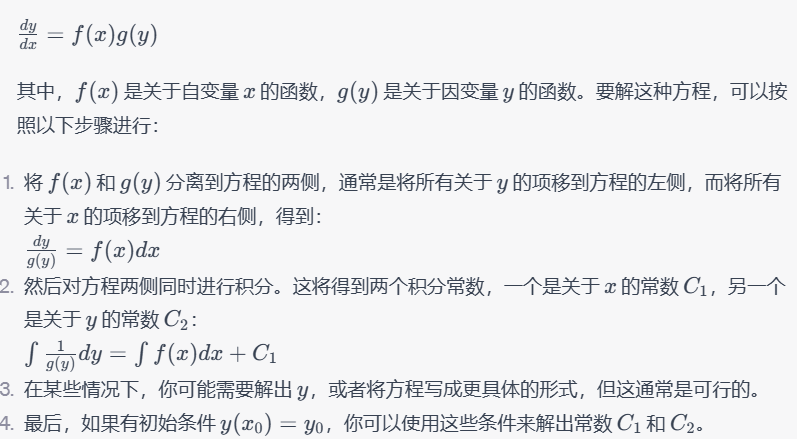 可分离变量的方程是一种常见的一阶常微分方程类型,其特点是可以通过将变量分离到方程的两侧,从而可以分别对各自变量进行积分。一般形式的可分离变量的方程如下: