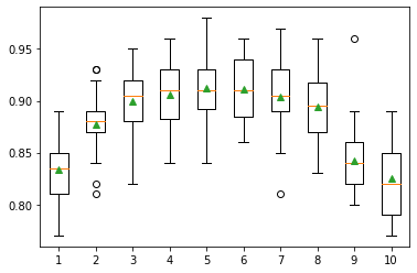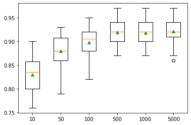 pyplot.boxplot(results, labels=names, showmeans=True)