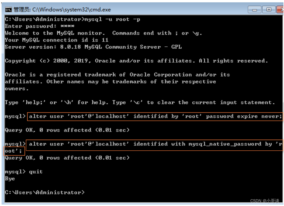alter user 'root'@'localhost' identified by '5441' password expire never;