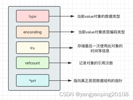 redis中每一个value都可以理解为是一个RedisObject,结构体RedisObject定义了5个属性:type、enconding、lru、refcount和*prt,如下图