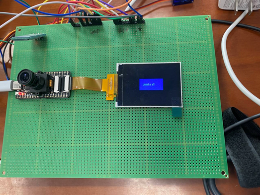register****”(**** 代表录入人脸编号)后按照 yolo v 2 算法采集 196 维人脸数据(3 轮 18 次采样),并储存在 SD 卡文件中,且屏幕显示采样进度,录入完成屏幕显示“successful”,蜂鸣器发低声。delete****”则删除对应用户储存在 SD 卡的特征值,蜂鸣器发高声。erase”则删除 SD 卡内所有用户人脸特征值,蜂鸣器发高声。open”则无条件控制舵机旋转。门禁模式时,设定比对阈值,高于则蜂鸣器发低声且舵机旋转,低于则蜂鸣器发高声舵机无反应。此外 RFID 数据通道开通,我们已给两张 S50标准卡与异形卡相同扇区注入不同信息,分别会有舵机与蜂鸣器的不同响应情形,当其他 RFID 卡靠近则默认发生系统错误并发出独有蜂鸣器声音(可以修改)。