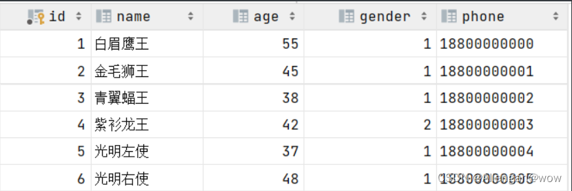 - User{id=1, name='白眉鹰王', age=55, gender=1, phone='18800000000'}