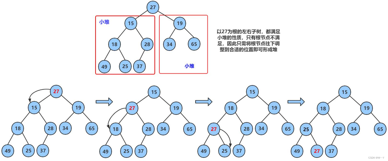 我们可以使用向下调整的方式建立堆,怎么建立呢?通过一组图片告诉大家: