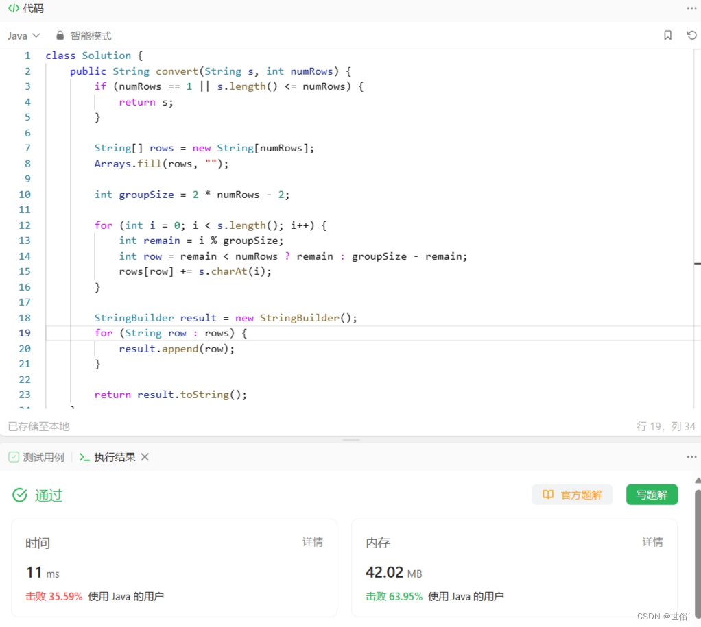 综上所述,使用数学规律的方法的时间复杂度和空间复杂度分别为O(n)和O(1),其中n为字符串s的长度。相比于模拟方法,这种方法在空间复杂度上有优势,因为不需要额外的数组来存储每一行的字符串。