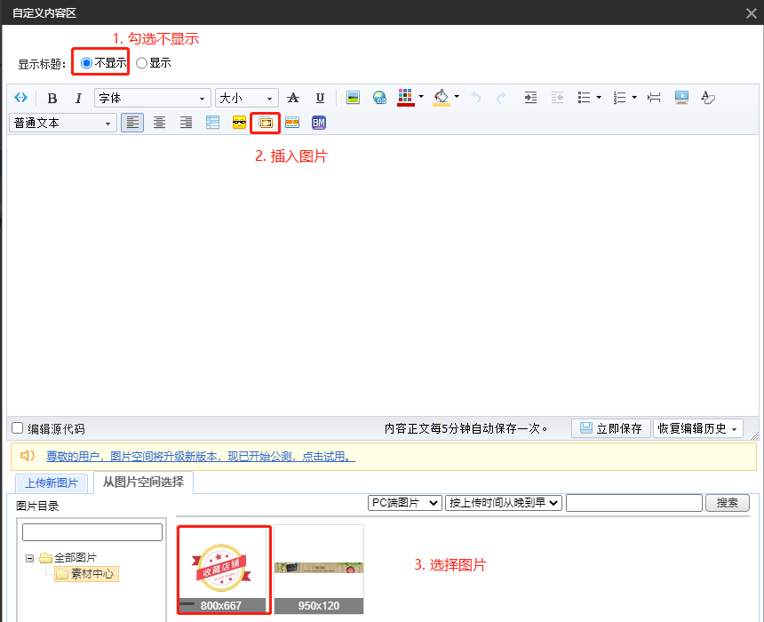 pc端、手机端、店招图/海报图, 都可以来这里制作, 制作完成上传到【图片空间】