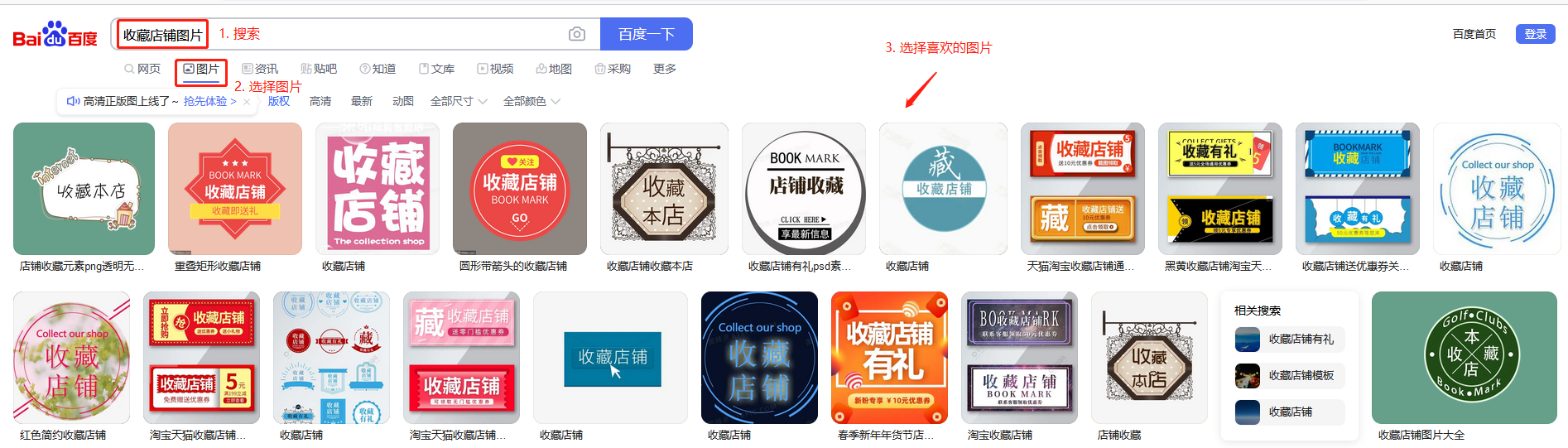 百度 - 搜索(收藏店铺图片) - 图片 - 选择图片 - 下载图片 - 上传图片到淘宝网的【图片空间】