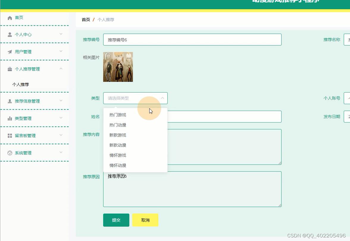 个人推荐 (自动编号、推荐编号、个人账号、发布日期、审核回复、相关图片、姓名、是否审核、用户id、创建时间、推荐原因、推荐名称、推荐内容);