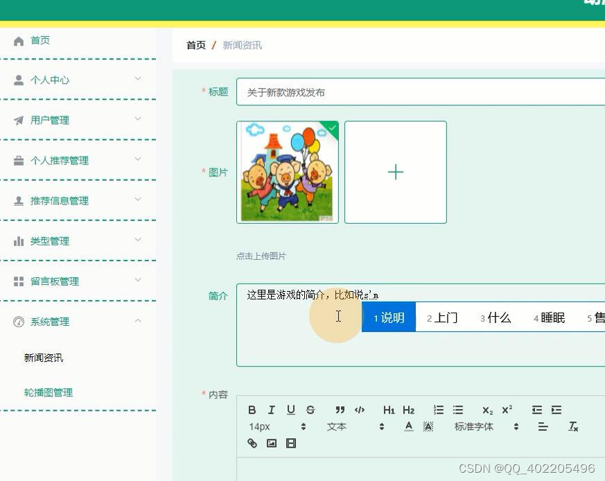 新闻资讯 (自动编号、标题、图片、内容、创建时间、简介);