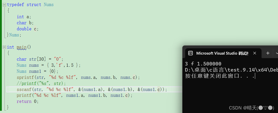 - printf("%d %c %f %s\n", nums.a, nums.b, nums.c, nums.str);