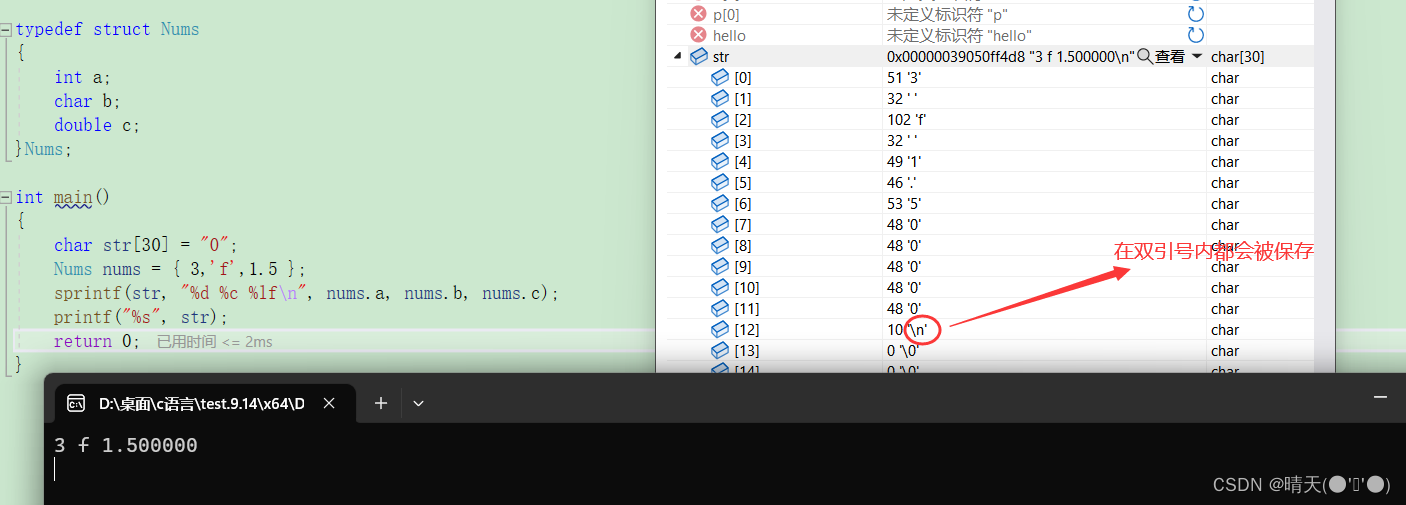 📖读取str内的元素放进nums1中去,此时再打印结构体变量nums1就会发现已经把str内的数据搬进nums1中啦。
