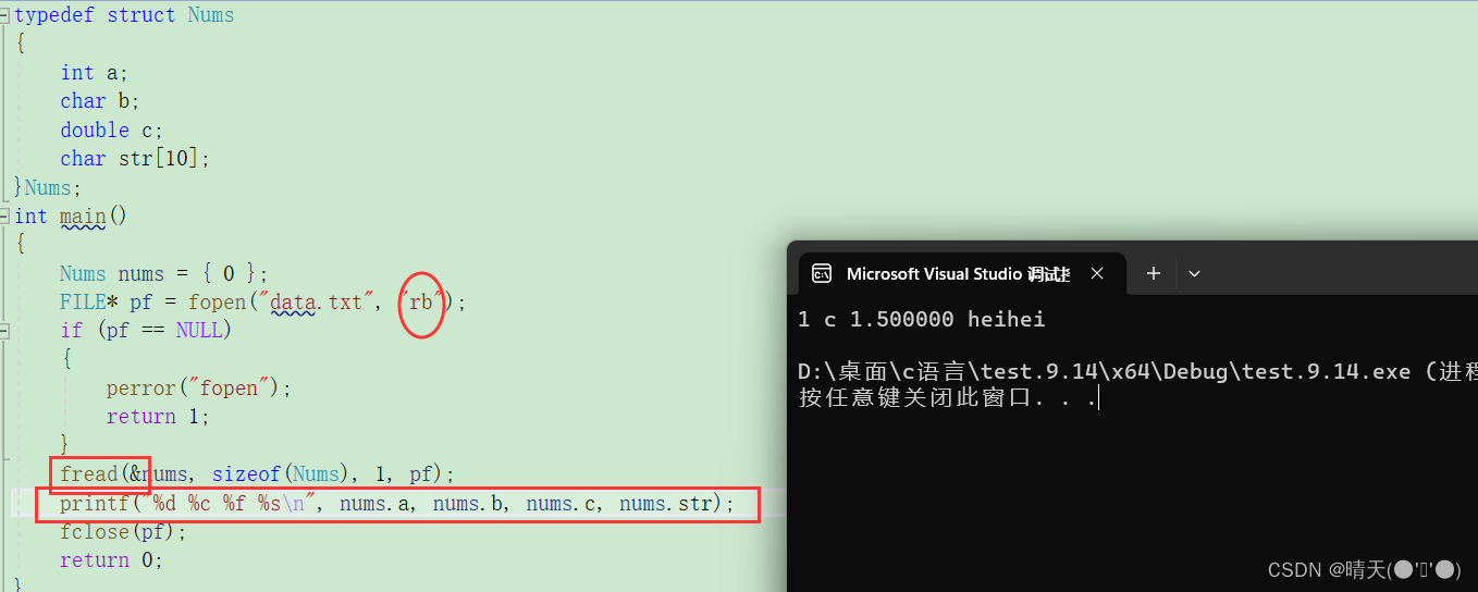 ⭐前边所介绍的fputc和fgetc函数,每次只能读写文件的一个字符,但我们在编写程序的过程中常常需要对整块数据进行读写,例如,对一个结构体类型的变量值进行读写,下面进行fread和fwrite函数。