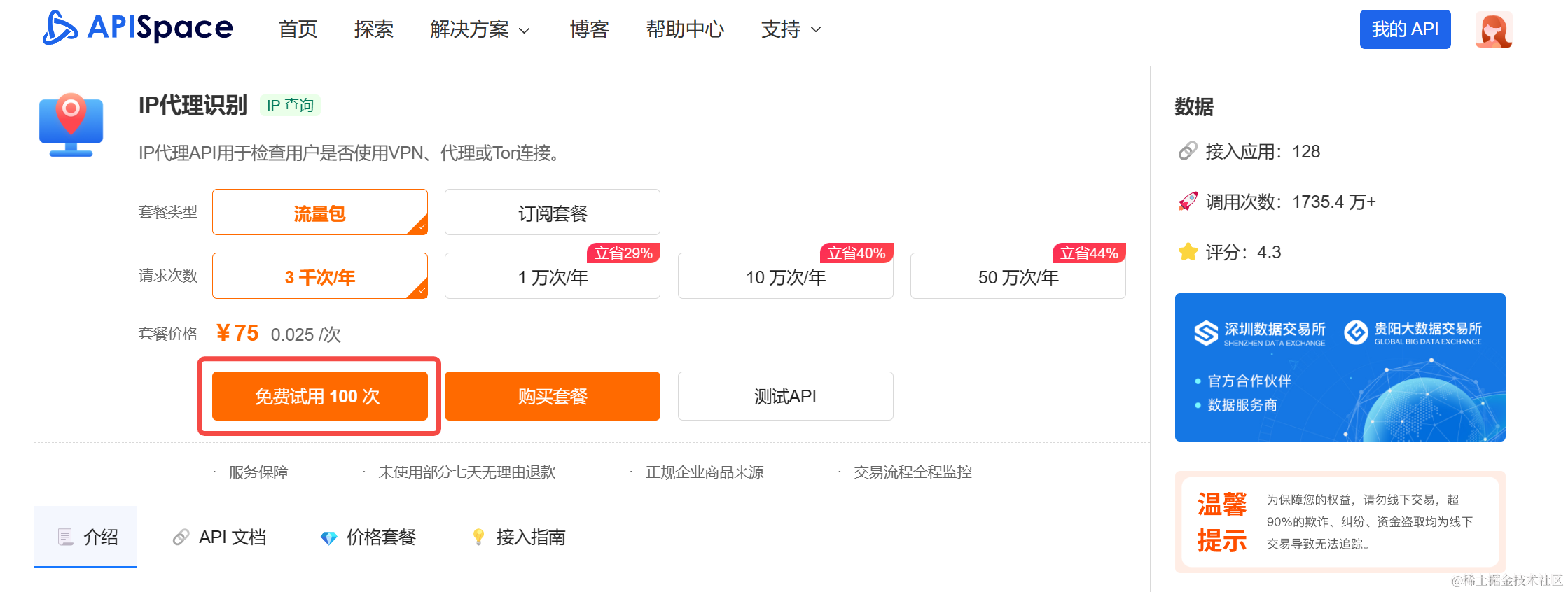 登录 APISpace ,进入【IP代理识别API】详情页申请接口。