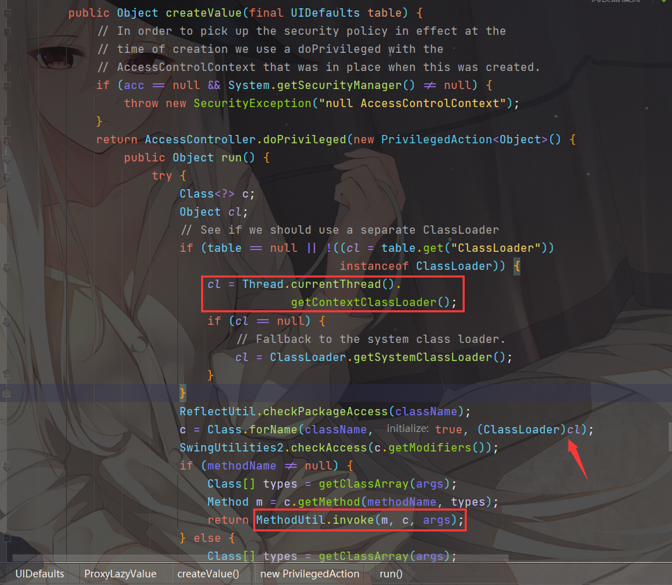 这里获取到classLoader ,所以就能正常加载nashorn.jar了,但由于 Hessian 序列化的机制,ProxyLazyValue里面的 field acc 在反序列化过程中会报错 , 所以需要将 acc 反射设置为null