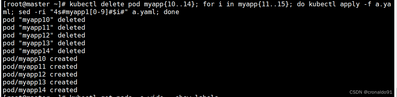 - [root@master demo]# kubectl delete pod myapp{10..14};for i in myapp{11..15}; do kubectl apply -f a.yaml; sed -ri "4s#myapp1[0-9]#$i#" a.yaml; done