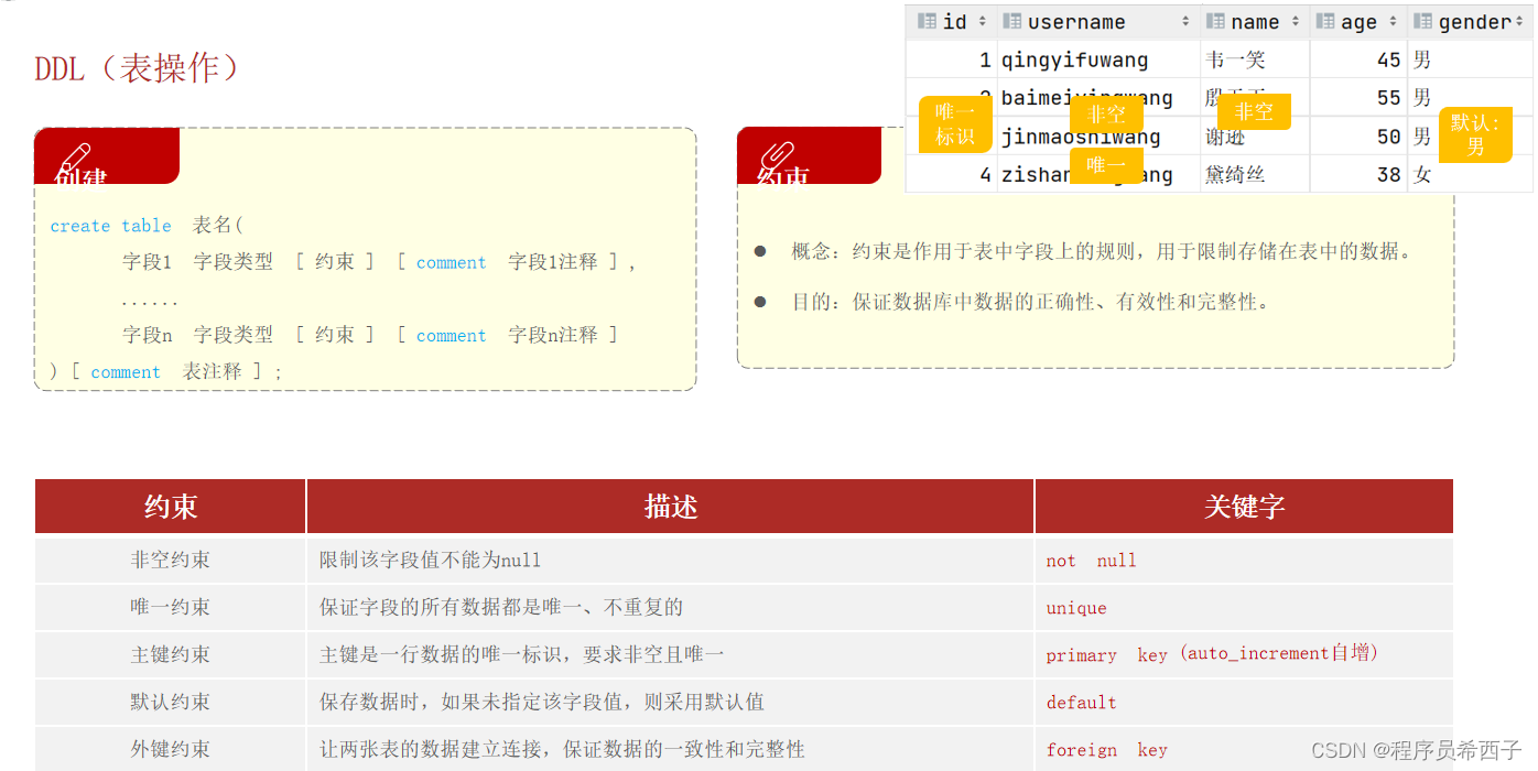 - id int primary key auto_increment comment 'ID 唯一标识',