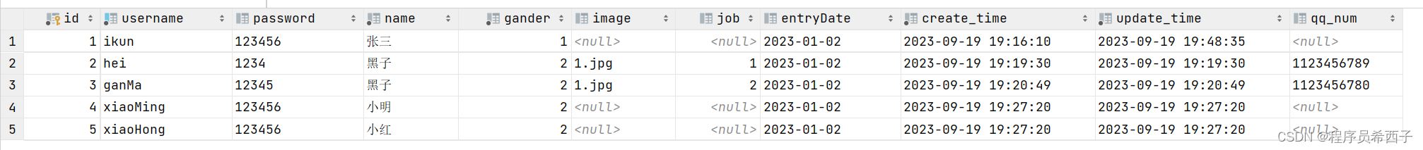 - insert into tb_emp(id, username, password, name, gander, image, job, entryDate, create_time, update_time, qq_num)