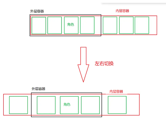内层容器: 用来存放角色头像,点击左右键或者角色需要滚动的容器。