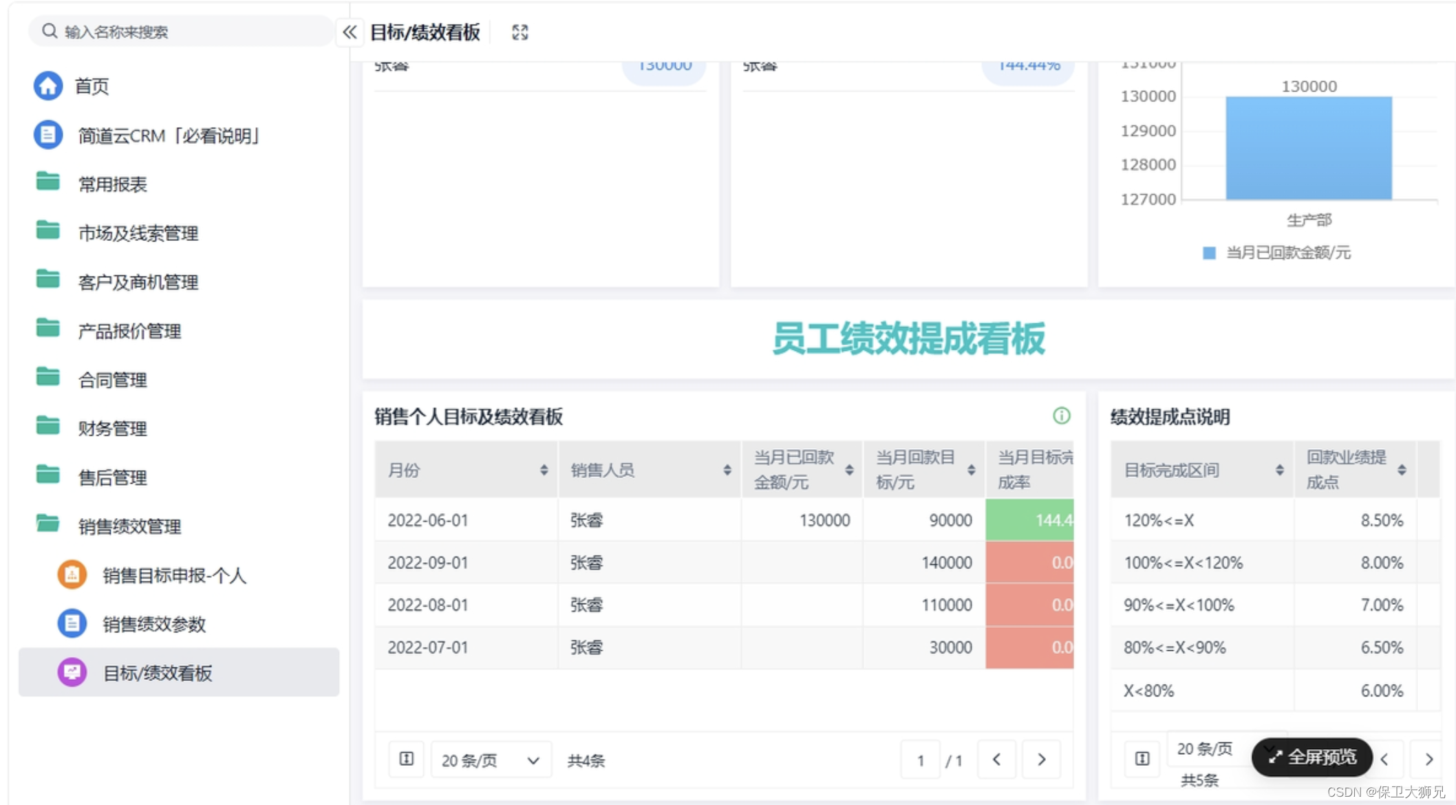 通过销售目标及绩效看板,可以查看各部门、各成员的回款金额、目标完成情况,并直接计算出各成员每月的绩效提成,掌握员工绩效的一手数据,便于进行人员管理。