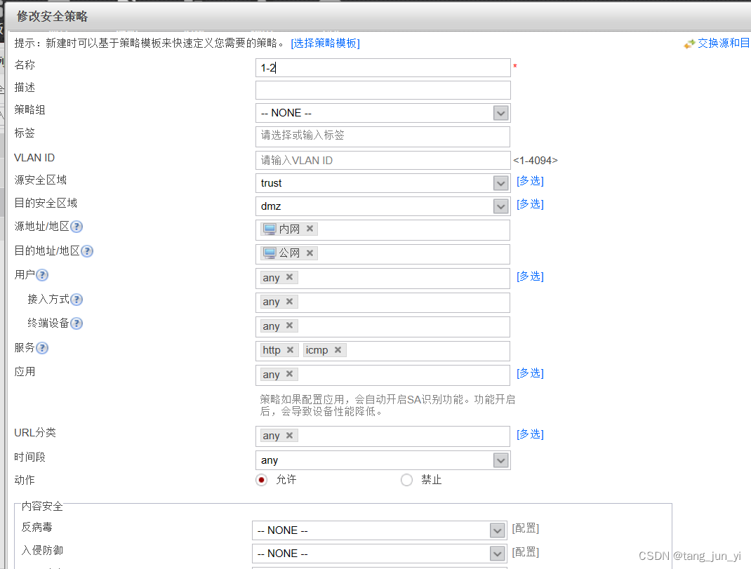 安全策略是控制设备对流量转发以及对流量进行内容安全一体化检测的策略,作用就是对通过防火墙的