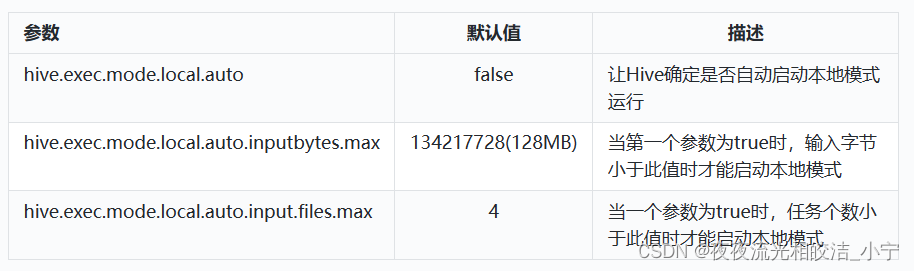 | hive.exec.mode.local.auto.inputbytes.max | 134217728(128MB) | 当第一个参数为true时,输入字节小于此值时才能启动本地模式 |