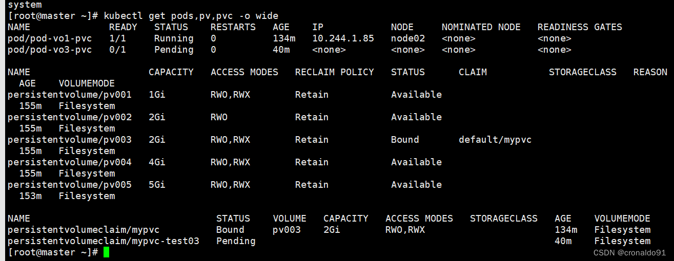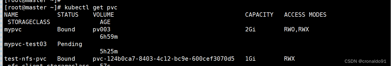 当没有符合要求的pv时,模式accessMode不符合或者在模式符合的情况下没有capacity栏里没有大于等于请求大小的,则pod和pvc都会处于pending状态