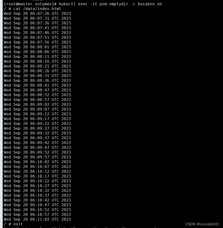 - #同时,在进入两个容器里,查看挂载数据卷的目录的数据,以验证两个容器之间挂载的emptyDir实现共享